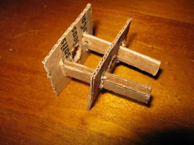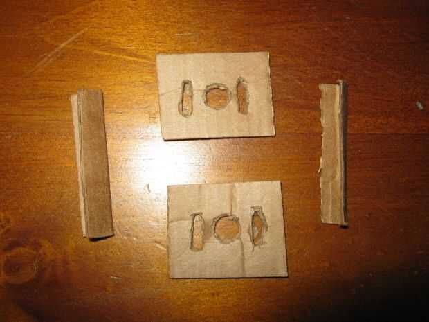 Los agujeros en los 2 soportes pueden hacerse usando las mismas técnicas, como se muestra en el paso 7 anterior, mientras que los 'Palitos' son piezas simplemente rectangulares de cartón de igual longitud, doblado por la mitad.