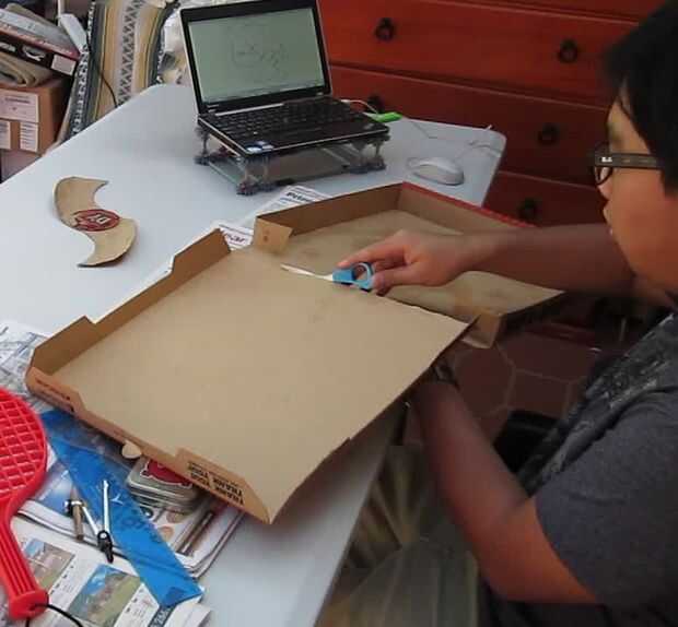 Si tienes una caja de pizza, diseccionarla. Cortar la punta superior (que no suele ser grasosa). Otra cosa, simplemente corte una pieza cuadrada de cartón de una caja, aproximadamente del tamaño de su ventilador.