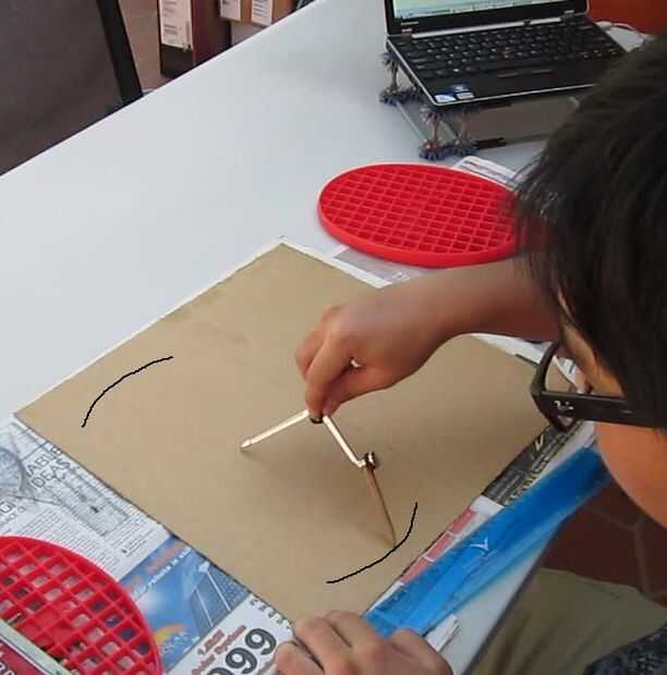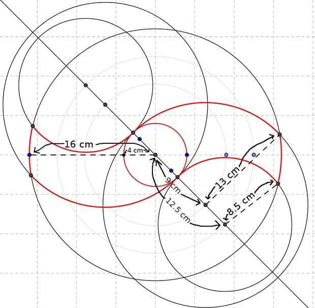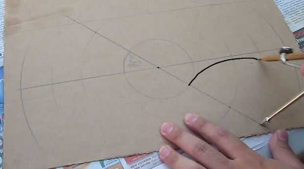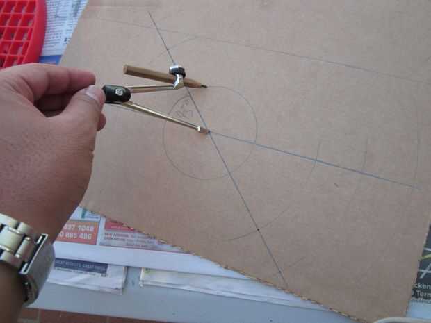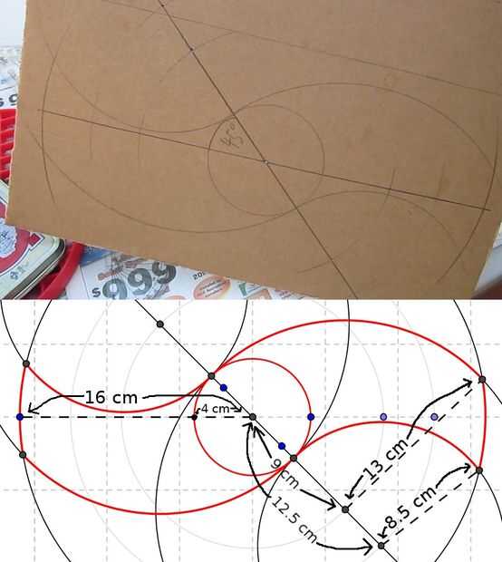 2. En 1 de las mitades, encontrar un punto de centro y trazar 2 arcos amplia frente a la otra, con radio de 16 cm.