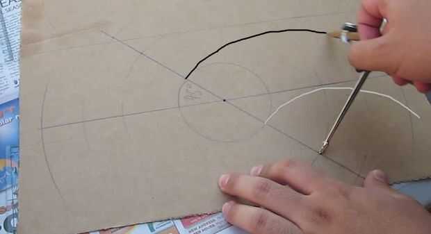 4. En la línea de ángulo, dibujar 2 arcos en cada lado con radio 9 cm y 12,5 cm cada uno.