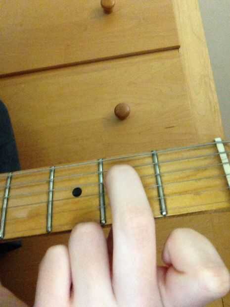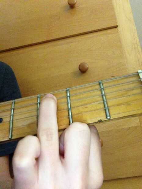 Tomar el dedo 1 y coloque en el 1 º traste de la 2ª cuerda. Luego tomar el dedo mal 2 y colóquelo en el 2 º traste de la cuerda 4ª. Por último, tomar el 3er dedo y colocar en el 3er traste de la 5ª cuerda. Se trata de un acorde de C.