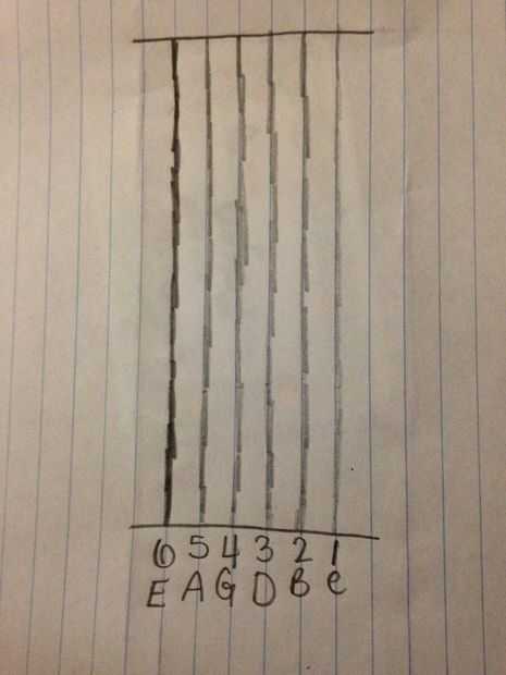 Cadena 3 es una G, cadena 4 es una D, cadena 5 es una A y la cadena superior, más gruesa, secuencia 6, es un bajo E.