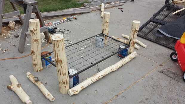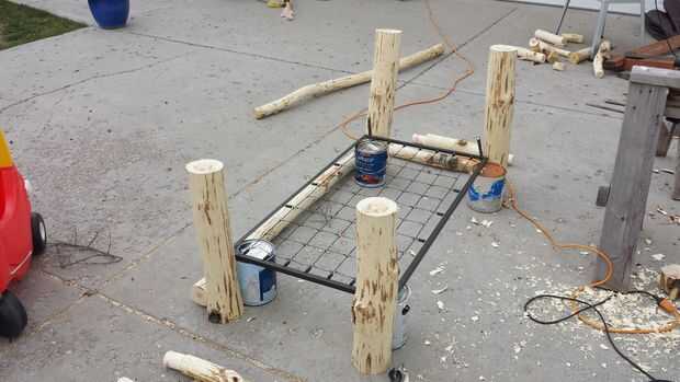 Una vez que tienes los registros y se pela la corteza y que han tenido suficiente tiempo para secar, puede comenzar este proyecto. Puesto que quería volver a utilizar los resortes y el colchón de la cuna de mis hijas pude obtener las dimensiones de la cama de aquellos. En este caso los muelles son 26 x 55 pulgadas.