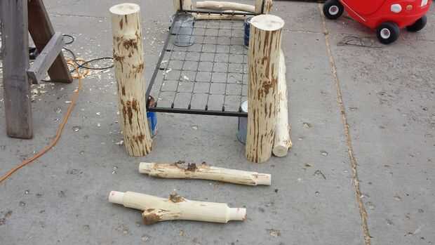 En este punto estás listo para comenzar a añadir pivotes en el estribo. Puesto que la cama es para un niño que quería asegurarse de que los husos estaban cercanos bastante juntos, que la cabeza de mi hija no se atascan. El código de edificación para los pasamanos es que no puede caber una bola de 4 pulgadas entre los ejes, así que decidí hacer mis 4 pulgadas aparte. para determinar cuántos husos le necesidad y dónde colocarlos en los travesaños, es mejor encontrar los registros que desea utilizar para los husos. obtener un diámetro promedio del tronco, y luego dividir por dos para encontrar el radio. Luego puede medir 4 pulgadas desde el primer poste de la esquina, luego agregue el radio del primer eje, que ahora tiene el punto de centro del primer eje, para el segundo eje, medida desde la marca que acaba de hacer, al radio del primer huso, más cuatro pulgadas, además el radio del segundo eje, luego marca el punto central del segundo huso.