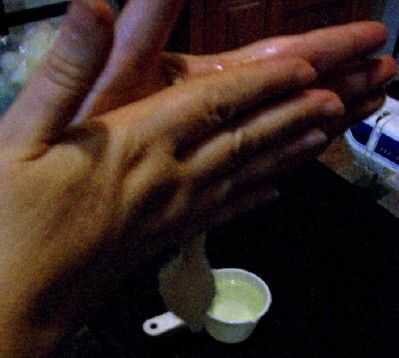 1. Add sobre 1/4 cucharadita de jabón líquido (o 2-3 gotas Synthrapol) a 1 taza de agua tibia (105-115F / C 40-46).