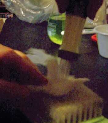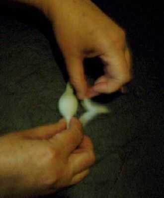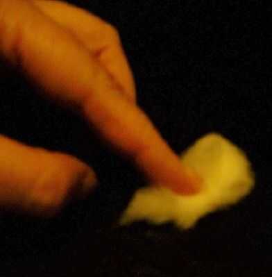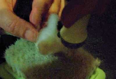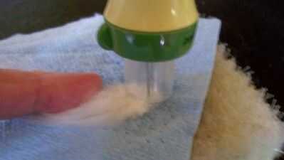 Sostenga la oreja formada contra la reja por la base (donde la oreja se fijan a la cabeza). Con la herramienta del aguja-batanado, apuñalar a cada parte de la oreja excepto la base hasta que la oreja mantiene su forma por sí mismo (con la herramienta de 7 agujas y lana merino, esto quedo con 20-40 puñaladas).