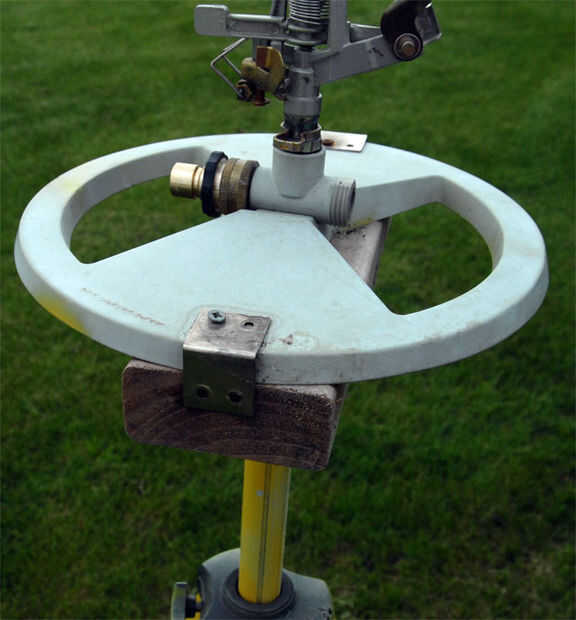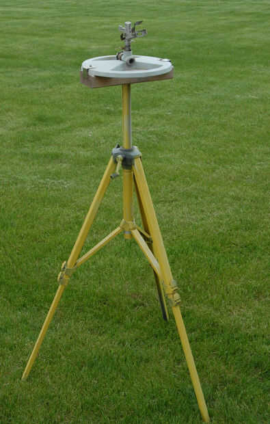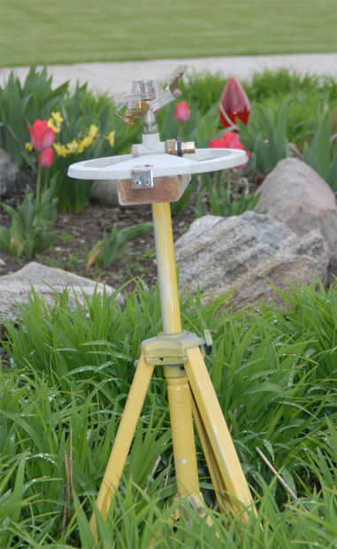 Mi fiel trípode finalmente se rompió. Un amigo puso mi regadera sobre el trípode como se ilustra en las siguientes fotos. La mejor parte es que usted puede agua sobre las plantas por lo que en algunos puntos hay más cobertura cuando usted tiene follaje alto.