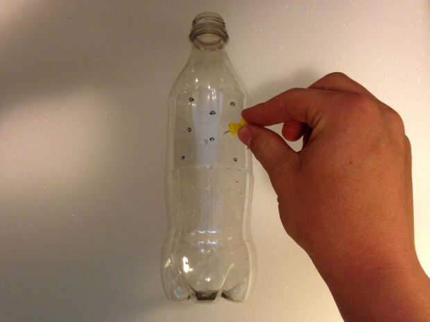 Utilizar una aguja o la tachuela para empujar los agujeros en la botella.