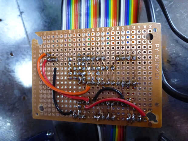 Cortar 20cm hembra a cable de cinta del arco iris hembra por la mitad y soldamos un extremo a la tarjeta de interfaz, pero en retrospectiva puede haber sido mejor macho a cable de cinta femenino y la soldadura del extremo macho a la tarjeta de interfaz. 10cm es suficiente.