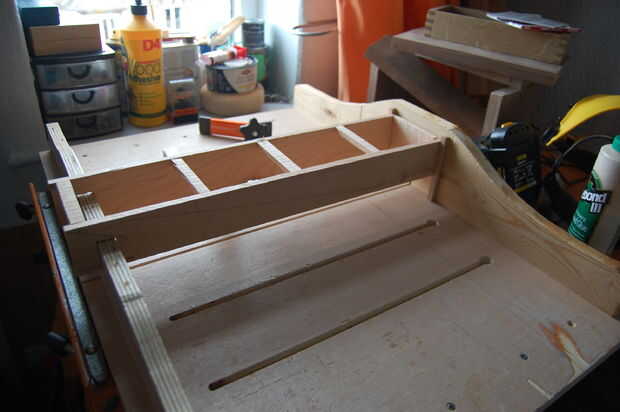 Después de determinar que sus dimensiones cortan un apropiado tamaño ranura en dos piezas de madera y cortarlos a la longitud correcta para encajar encima de la valla frontal y parada apenas tímido de la cara frontal de la valla trasera. A continuación, pegado y clavado en el panel de extremo y algunos pequeños trozos de madera entre las dos piezas para hacer el marco. Yo estos espaciados por lo que coincidiría con los extremos de los paneles de plástico. Después de eso pegados y clavados algunos bits más a la valla trasera del trineo para hacer una guía para el marco.