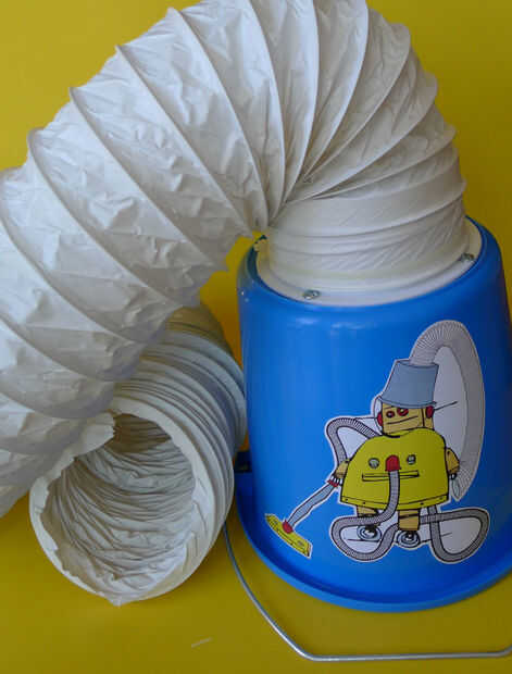 La aspiradora portátil se muestra aquí tiene su escape en la parte superior y su forma redonda permite conectar la manguera fácilmente: aquí un cubo fue utilizado como una pieza de convertidor.