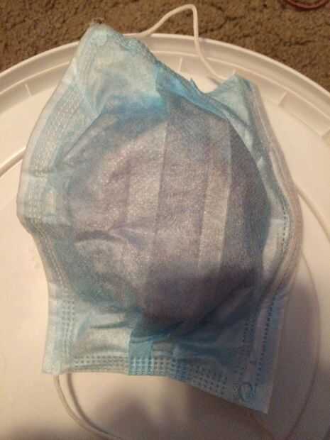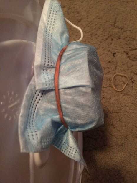 Ahora ponen una de las bandas de goma al corte que en la parte inferior de la tapa. Obtener la máscara de polvo y ponerlo en la banda de goma en la Copa. Haz otra goma y ponerlo sobre la máscara de polvo. Asegúrese de que la goma bandas totalmente cubriendo la máscara de la oscuridad.