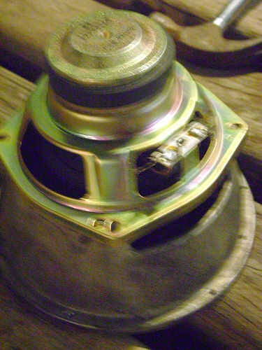 Arranjei UE este alto-falante e o del condensador, vieram de um velho microsistemas. O condensador é de 220µFx16V, num alto-falante de 8Ω, o nos dá uma freqüência cruce de 90, 34Hz, segundo este sitio aqui: http://www.carstereo.com/help/Articles.cfm?id=1. O abrazaderas hacer alto-falante é de 12cm.