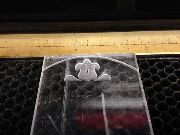 Corrimos un pase de prueba para ver la profundidad del grabado - queríamos el diseño para destacarse! Puesto que es una pieza bastante grande, la aguafuerte del laser tarda un tiempo - la prueba pasa nos práctica en trozos más pequeños así que no perdemos el material.