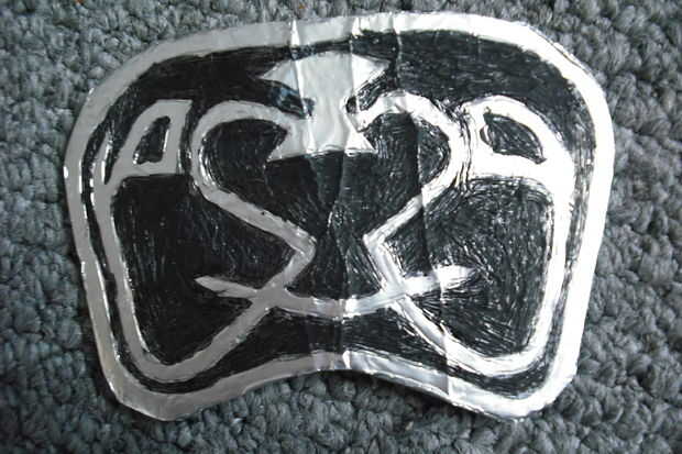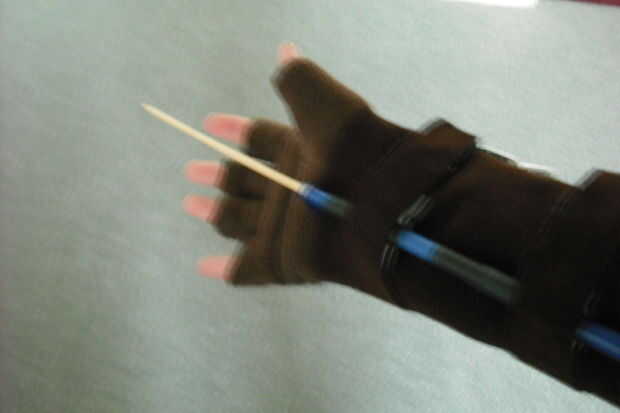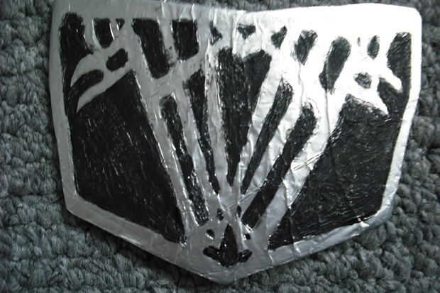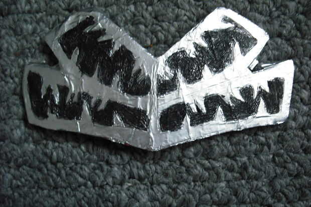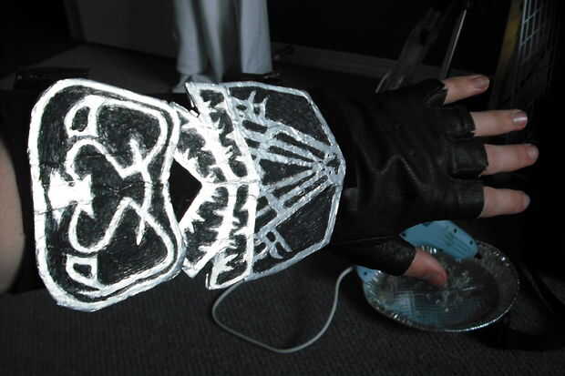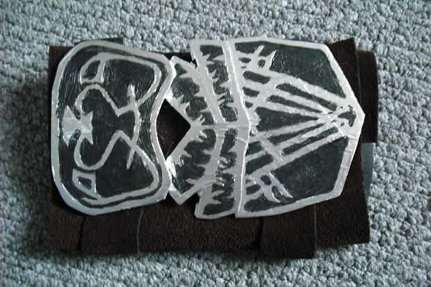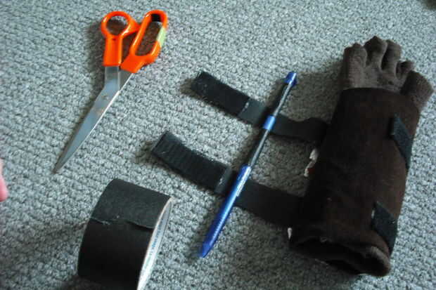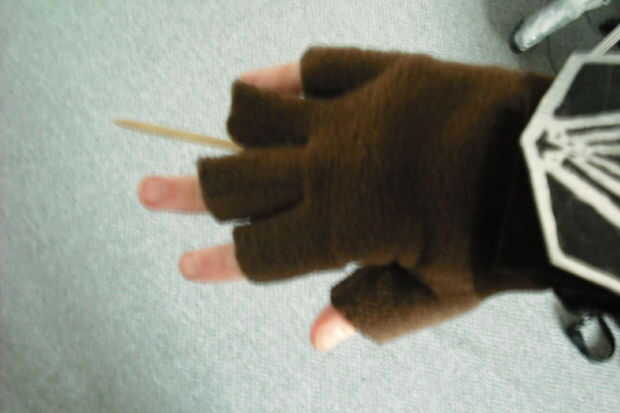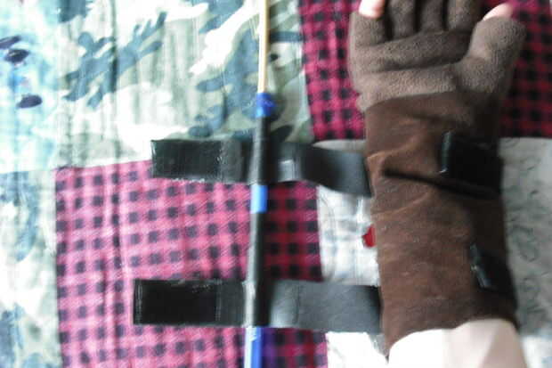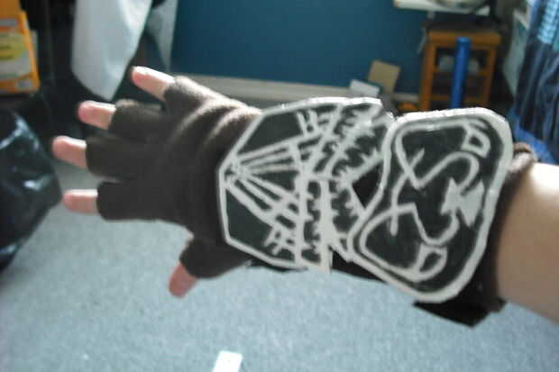 Los guantes eran viejos, y la tela del brazal era chatarra, hotglued junto (no puedo coser).
