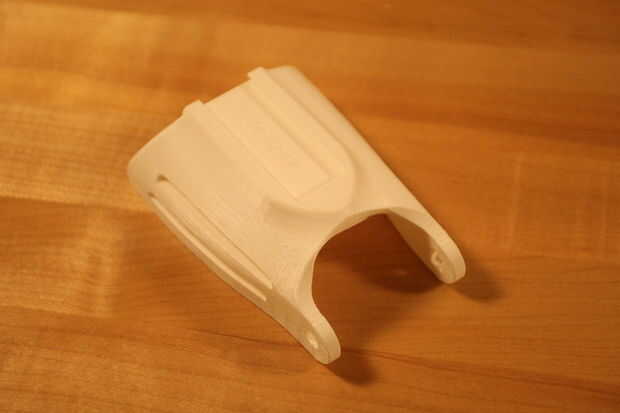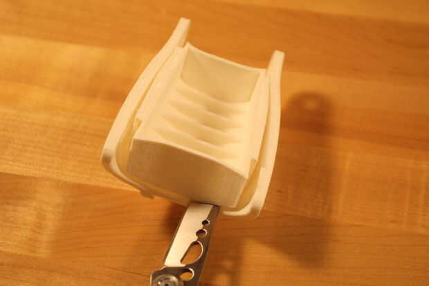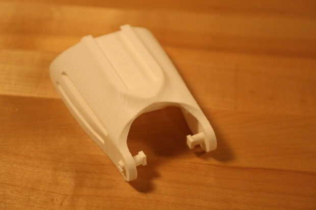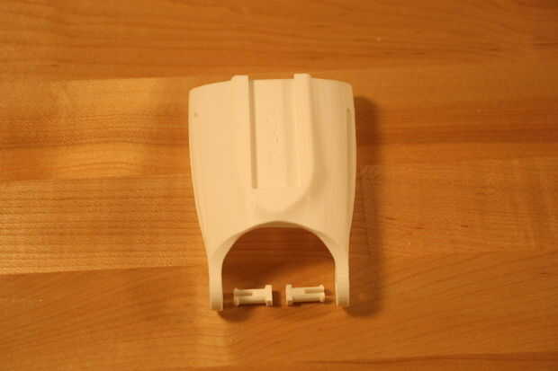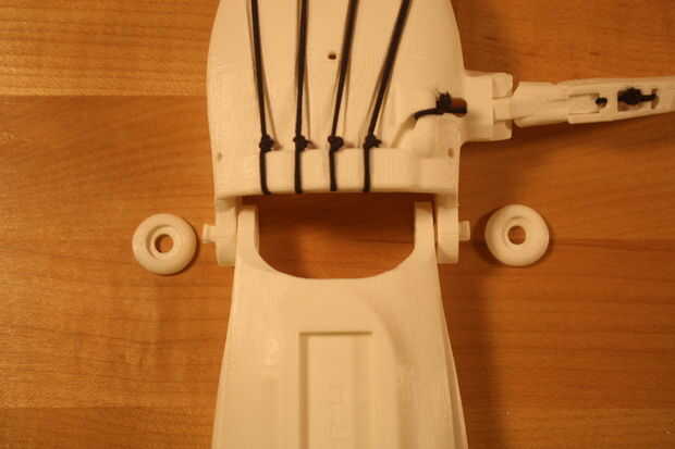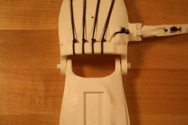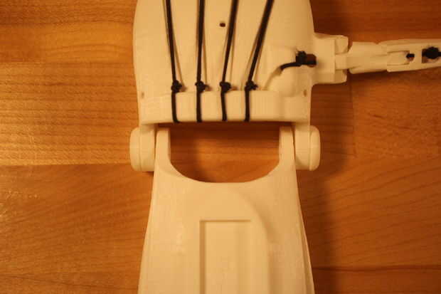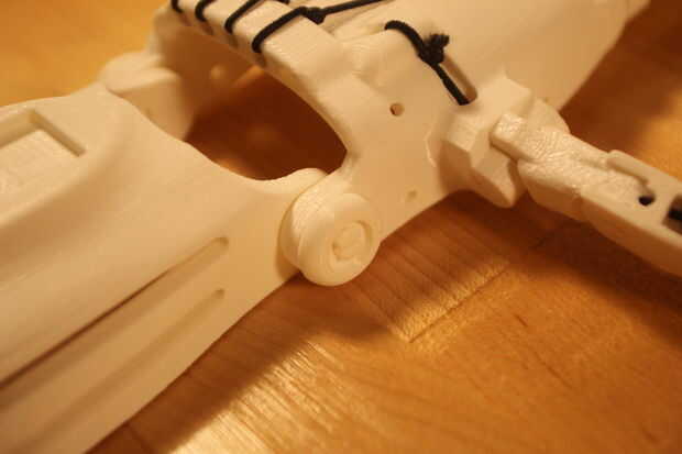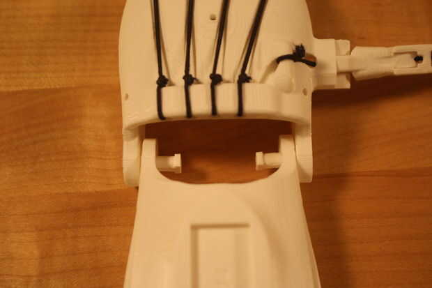 Utilizando una herramienta cortante, retirar la estructura de soporte de guantelete y ponerlo aparte para el uso en el siguiente paso. Presione los pernos de presión dos muñeca a través de los agujeros en el guante, asegurándose de que estén alineados con los huecos de la cabeza en las caras interiores del guantelete. Una vez que han roto a través, de nuevo las puntas hacia atrás y deslice la palma en posición para que quede alineado el eje de la muñeca. Presione los pernos de la muñeca a través de orificios de muñeca de la palma. Si es necesario, puede doblar la muñeca hacia atrás y la esquina de una mesa se puede utilizar para aplicar presión a los pernos. Una vez que los pernos estén sentados correctamente, ajustar las tapas de pin sobre cada pasador para completar la muñeca.