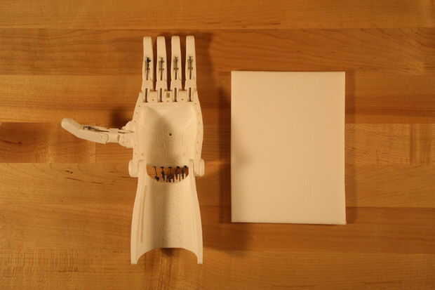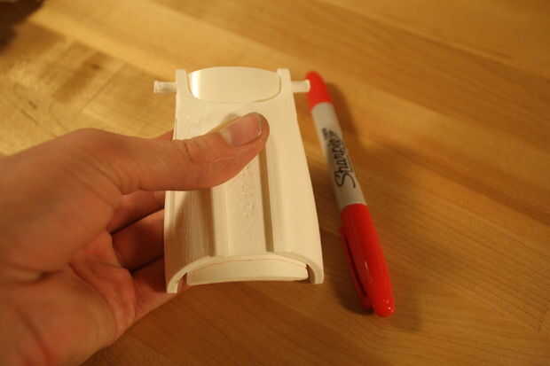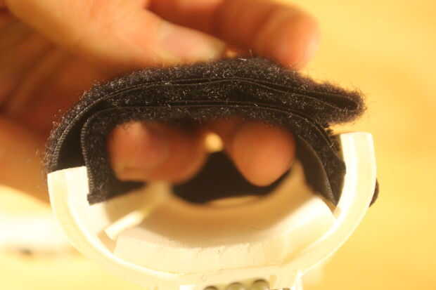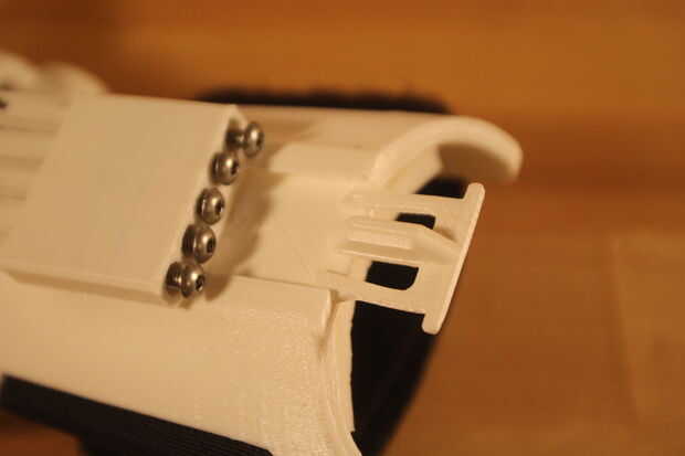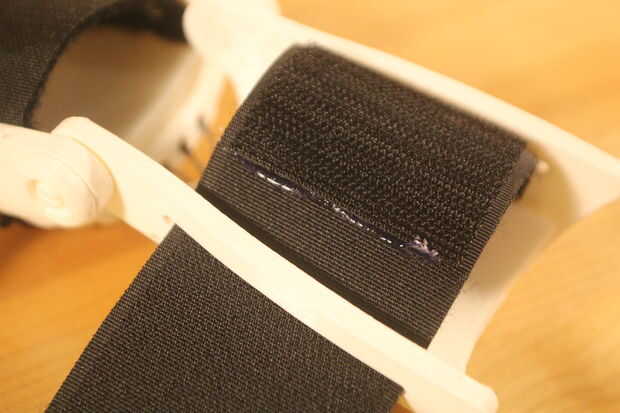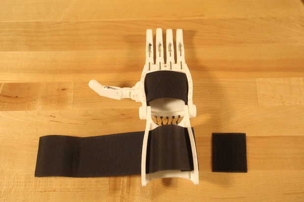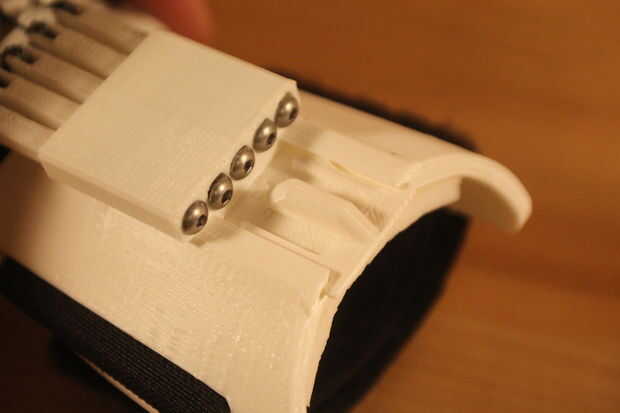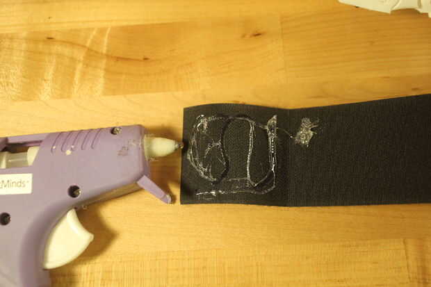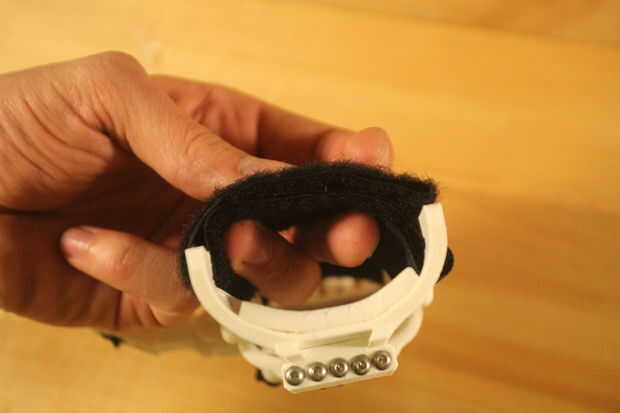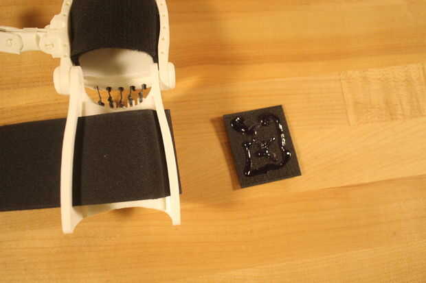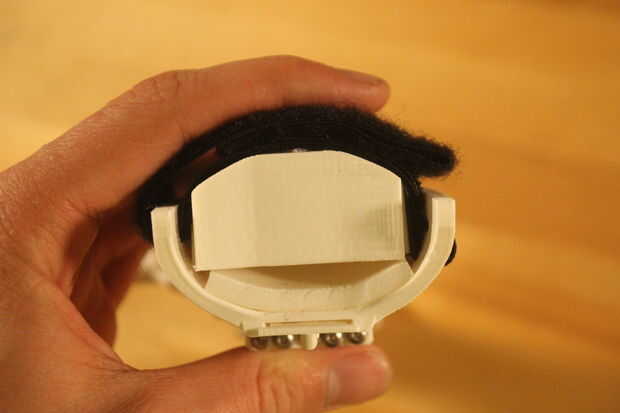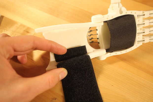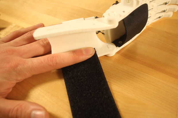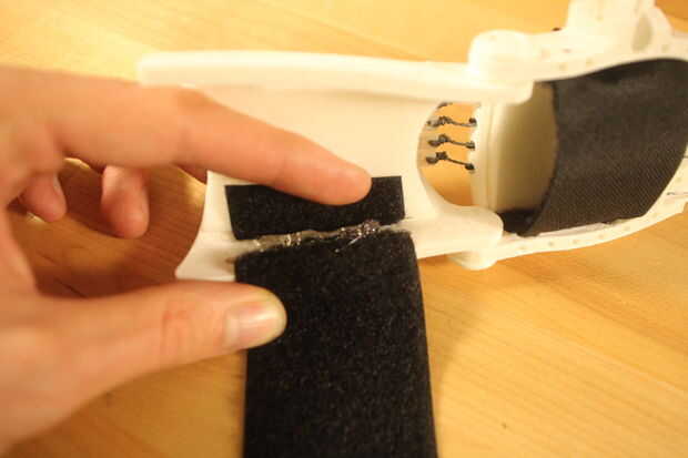 Después de aplicar la espuma, corte una tira de velcro de doble cara o suave para ser un poco más de la mano montada. Deslice la correa a través de las ranuras de "fondo" (la más cercana a la plataforma de la construcción durante la impresión) en el guante con el lado suave hacia la espuma. Coloque el extremo largo de la correa en el mismo lado que el pulgar y meta 1.5"(38mm) del extremo corto por la ranura de"top"y doblar a cumplir con el lado largo de la correa. Luego puntada o hotglue este extremo corto hacia la correa larga. Doblar el extremo largo de la cinta regresa el sí mismo (hacia el guantelete) para que cuando se pliega una vez más, puede llegar al borde más lejano del guante Dónde está el extremo corto de la correa. Caliente pegamento o coser el extremo doblado hacia el extremo largo de la correa. Si usando el velcro de dos caras, el extremo más largo debe tener los lazos suaves en ambos lados y puede apretado abajo y fijarse en los ganchos de la parte de correa entre las alas del guantelete. Si el uso separado lazo y gancho tirantes, corte y caliente pegamento o coser que una sección de la correa del gancho a la zona de la correa entre las dos alas para que el extremo largo de la correa puede fijarse allí. Esta configuración de fleje está diseñada para ser fácil de usar con la otra mano más diestro.