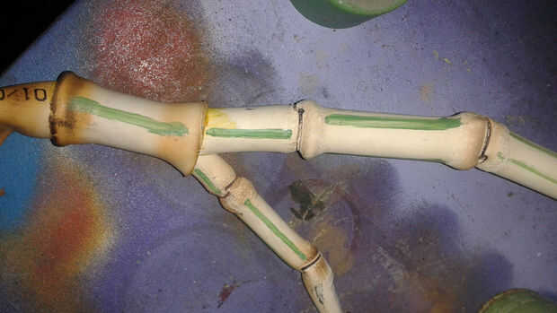 Aquí otra vez tenía mejor fotos paso a paso, pero les perdí en mi problemas de cámara. Para una mejor idea de cómo pintar la imitación bambú, ver el original instructivo que vinculado previamente. Usé un hisopo de algodón para agregar rayas verdes a los cuernos. Fui con una ligera capa de color amarillo pálido seguido por una ligera capa de color caqui. He utilizado varios tonos progresivamente más oscuros de marrón para oscurecer los nodos. Añadí algunas salpicaduras negro y luego pintar algunos de los puntos verdes. Volví con un velo de color caqui y algunos pálidos reflejos amarillos. Resalté las puntas de los puntos con amarillo muy débil.