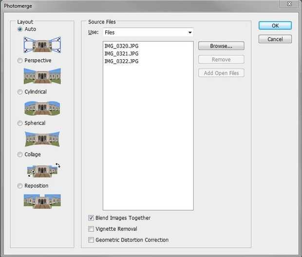 Una vez que la abre ventana de Photomerge le permitirá navegar por thw conjunto de imágenes quieres combinar en un panorama, cargarlos y asegúrese de haga clic en la función "Auto" en la izquierda de la ventana. Eso hará que la vista panorámica más realista.