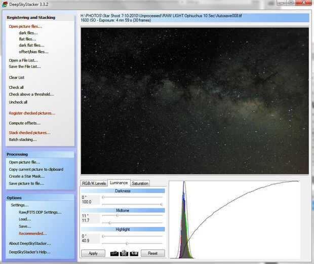- Ajuste la salida de DSS como si fuera una imagen RAW que se prepara para editar. Ajustar la curva de luminancia para armonizarla con el histograma. Si hay un tinte de color extraño, utilice los niveles RGB/K para solucionar este problema. La saturación puede ser que necesite ser aumentado si la imagen se ve demasiado gris.