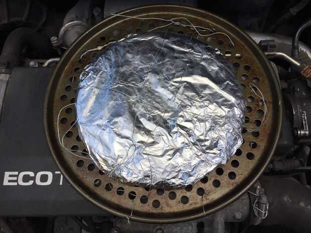 Cuando estén todos los cables de ancla es tiempo para cargar para arriba de la pizza. Sólo envuélvalo en papel de aluminio dejando un espacio por encima de la capa. Luego enrolle los lazos y curva nuevamente para asegurar la pizza. No necesitan ser tirado hacia atrás firmemente, ya sería presionar la hoja sobre el queso, causando un desastre más adelante.