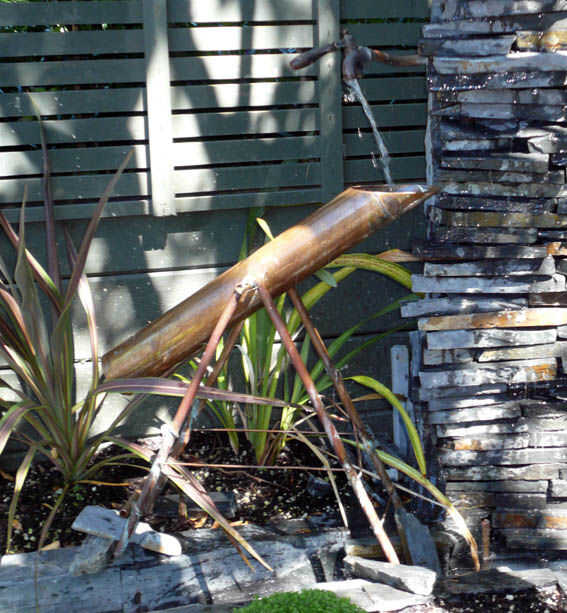Recientemente había puesto en una cubierta nueva en el patio de mi casa y quería construir una función de agua para añadir un punto focal. Por consiguiente, he construido una "pared de agua", con el agua se bombea de un colector de aceite en un recipiente que luego se desborda y corre por la cara de la pared fieldstone apiladas. Hasta ahora, bien. Sin embargo, pensé que añadiría un poco de arte cinético y sonido añadiendo una versión cobre de shishi odoshi, un dispositivo tradicional usado, supuestamente, en jardines japoneses para ahuyentar a los ciervos de forrajeo. ¿Por qué cobre, cuando el material tradicional es bambú? Bueno, en primer lugar porque me gusta trabajar con cobre - me gusta especialmente la forma en que se convierte en patinado con un verde cardenillo en el tiempo y también sentí que colocada mejor con mi pared de piedra gris y la total "look" que iba. El diseño actual fue muy simple y hay una serie de anuncios en línea que le dará una idea de cómo hacer uno de estos. En principio es bastante sencillo. Un tubo hueco se monta sobre un eje (que a su vez se monta en algún tipo de soporte, o las piernas). El extremo posterior del tubo está sellado, maneras detrás del punto del eje de eje por lo que puede ser llenado con agua. La puesta del árbol es importante porque debe ser adelante del punto de equilibrio de tubo vacío, para que la voluntad de extremo posterior más pesado del tubo, cuando es vacío, caer, tirar de la "boca" abierta del tubo hacia arriba, permitiendo que se llena de agua de un grifo del goteo, o similar origen.