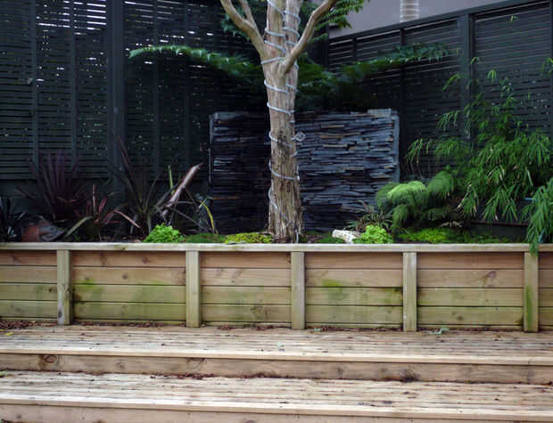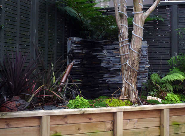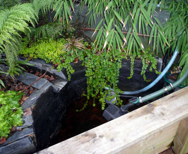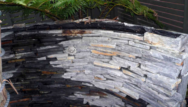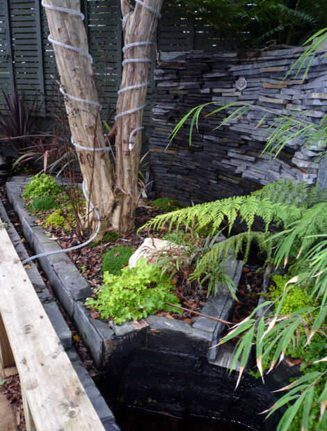 Se trata de una casa antigua con un extremo trasero de la yarda que mira hacia arriba en la ladera de una colina empinada. El suelo es de arcilla y conseguimos un montón de agua que corre por la colina y no un montón de sol allí, así que el área era húmedo, fangoso y perdido. Después de intentar infructuosamente crecer césped detrás allí hace unos años decidí sólo cubren el área entera con una cubierta elevada. Hasta ahora, tan bueno, pero en la esquina trasera mirada un poco bla y rasgos, así que he elegido tener un ir a la construcción de una característica del agua para animar las cosas un poco. ya había un bonito árbol en la esquina, así que subió con un diseño para una pared de agua de piedra de basalto negro. El agua es bombeado desde un colector de aceite a un depósito construido en la parte superior de la pared y desde allí desborda y salpicaduras hacia abajo la parte frontal de la pared en una colección del canal, en medio de algunas plantaciones de Niza y desde allí, hacia el sumidero para recirculación de la bomba sumergible.