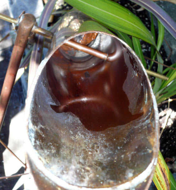 La parte posterior de la tubería debe sellarse para hacer el tubo de cobre de gran diámetro de un bote, no sólo un cilindro hueco. Utilicé un disco de cobre, doblado alrededor de los bordes que me diera un labio y había golpeado esta varias pulgadas en la tubería, donde yo soldado lo en su lugar, otra vez asegurando un sello hermético. Paradero a este lugar, esto depende de la longitud de la tubería. Debe ser lejano detrás hacia delante lo suficiente cuando es vacío, el tubo vuelve al vertical, que recoge la posición, pero lo suficientemente lejos (es decir suficientemente cerca del centro) que cuando el tubo está lleno, el peso del agua hace que el tubo caiga, descarga la carga y liberando a swing vertical hacia atrás, golpear el gong como lo hace.