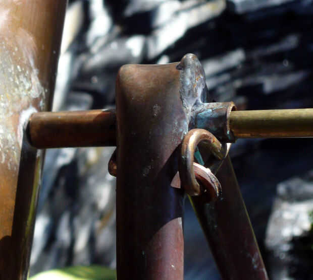 El cobre recogida y descarga buque había hecho ahora tuvo que suspenderse en las piernas y un gong sorprendente siempre. Las imágenes muestran que utilicé tubería de cobre, debidamente doblado a la forma y la barra del eje fijada con fijación de alambre. Un segundo tubo de cobre actuaba ambos como una llave de cruz para el marco de las piernas y un delantero para el efecto de gong. Esto debería ser bastante clara de las imágenes de abajo.