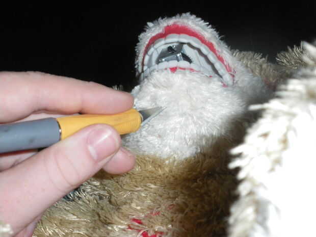 Usted tendrá que cortar un pequeño agujero en la mandíbula inferior para que se puedan introducir la clave para los dientes del viento. Era un poco scary whatching charla por primera vez.