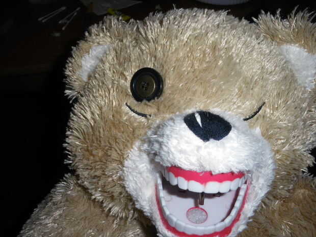Esto puede no ser necesario para el oso, pero he añadido un nuevo ojo para darle un aspecto siniestro. Usé dos botones para darle cierta profundidad. Coser la primera de ellas en, luego super pegados el uno más pequeño en la parte superior.