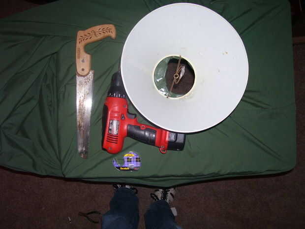 Para este instructivo, usted necesitará: Una vieja mesa, que puede cortar un agujero en Un recipiente con un agujero en la parte inferior o una pantalla Un taladro eléctrico Una sierra de mano Una manta o sábana grande Un rollo de cinta scotch