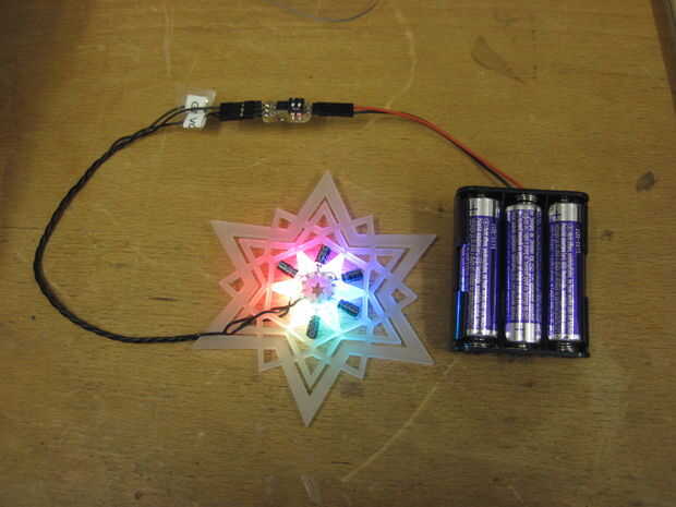 Ya que utilizando un arduino para controlar la WS2812B dentro de mi decoración de Navidad fue un poco overkill diseñé más pequeño: haciendo algunos copos de nieve de independiente por ejemplo como regalos (manteniendo mi arduino :-)
