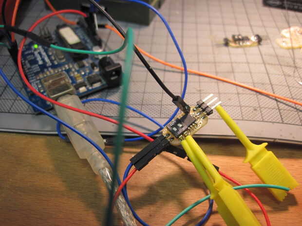Volver a la webside de Alta baja tecnología : usando mi antiguo Arduino como programador ISP y la conexión VCC, GND y MISO/MSOI/SCK/Reset de lo Attiny con los pasadores de 13-10. No olvides el capacitor de 10μF entre Reset y la tierra en el Arduino... Pero todo esto se explica mejor en su página web.