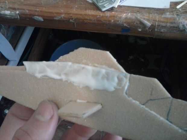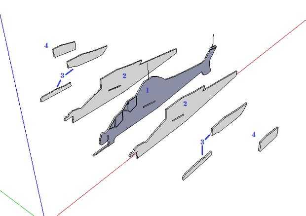 Luego aplique una capa delgada de pegamento sobre el área que se muestra en la figura 4. No pegar el lado entero, sólo las partes que serán cubiertas por la siguiente parte. Entonces deslizante en la parte marcado con (2) en esta área. El ala debe ir también a través de la ranura en esta parte.