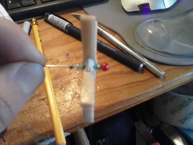 En un segundo pasador deslice en el siguiente orden: 2 granos, el eje del rotor de cola y tres granos. Asegúrese de que el pin va a través del centro del cubo pentagonal.