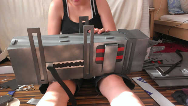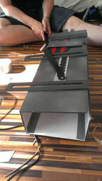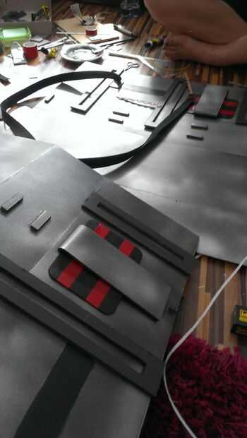 Las cajas están casi a punto de ser cerrado. Antes de hacerlo, añadir todos los detalles que desea agregar. Es mucho más fácil hacerlo así, trabajando en cajas cerradas. De hecho, utilice un tornillo para añadir la cinta a la caja. Esta forma es todavía flexible y giratorio. Se utilizará el clip grande que ver en la parte superior la pieza rojo-negro-rojo para sostener las cajas a la altura correcta de las piernas y todavía darle la oportunidad a caminar normalmente. Clip de ésos en el arnés de su apretado.