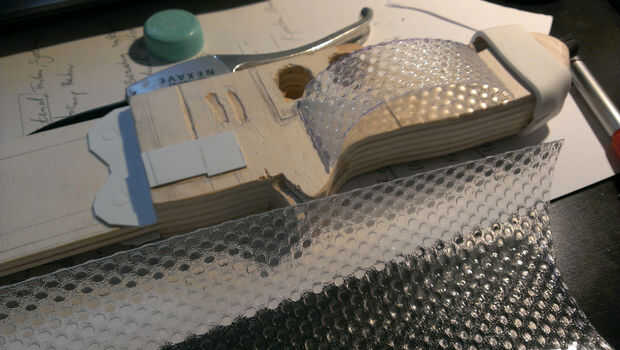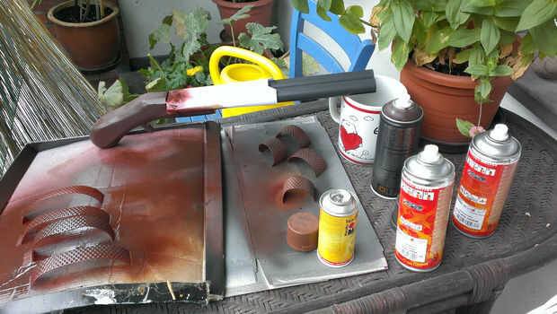 Los detalles son hechos de espuma y quedos ieces de la rotura de la bicicleta. El mango también necesita algún apretón! Utilicé lo de colchón silikon cocina de IKEA para esto. Hice una plantilla de papel, lo transfirió a la hoja de silikon, recórtalo y aerosol pintado. (pic6)) jaja puedes ver mi pistola tiro sobrenatural prop en este cuadro también XD)