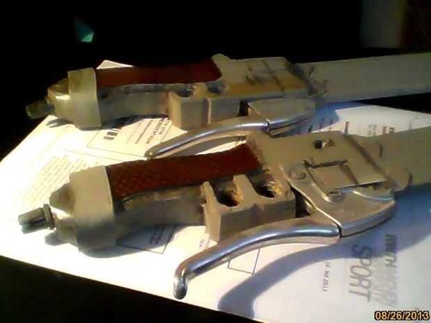 una vez totalmente seco el pegamento podría tomar las espadas a la máquina de lijado y arena de todos los golpes y larg y bordes puntiagudos. Añadí algunos detalles con una herramienta de talla de mano Dremel y suavizar algunos bordes en formas redondas.
