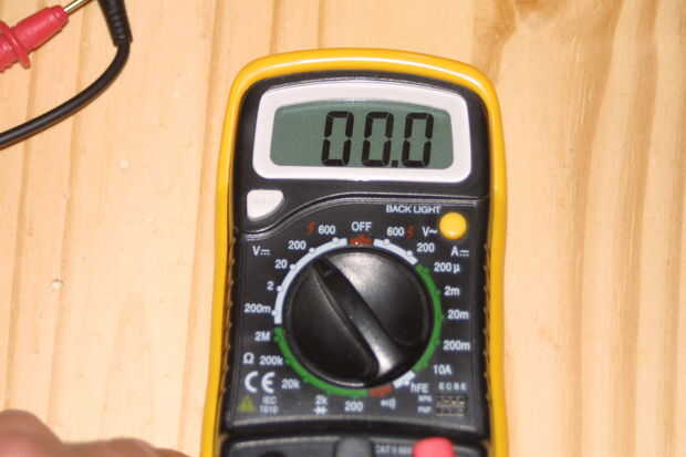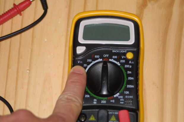 El modo que desea utilizar aquí es tensión. En mi medidor es un capital "V" con algunas líneas rectas junto a él. La tensión alterna tiene una onda sinusoidal a su lado.