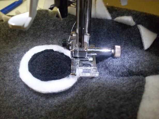 Coser los ojos, aproximadamente 2 pulgadas de las costuras laterales. Cosí el círculo negro en primera para no tener que cambiar mi hilo un tiempo extra. No importa qué orden hacerlo en, sólo recuerda comenzar con el hilo del color adecuado.