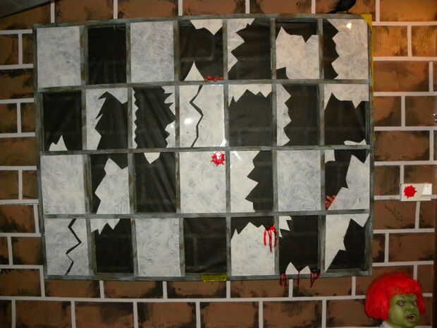 La ventana de la fábrica era realmente el punto de partida para nuestra fábrica y condujo las ideas creativas para el resto de la instalación.  La ventana es un marco de madera que hemos pintado y angustiados al ver como marcos de plomo encontraron en un viejo abandonado almacén de la fábrica.  Los cristales ellos mismos son un montón de portadas plásticas claras de informe que nos dieron en una tienda de suministros de oficina local.  Habíamos pensado usar transparencias impresora pero el informe de portadas eran mucho más baratas!  Después hemos pintado un lado de las cubiertas claras con pintura color crema en movimientos circulares para que se vea como se había enjabonado para arriba.  Utilizando y exacto cuchillo cortamos algunos de los cristales como cristales rotos y luego nos las grapas en su lugar.  los paneles con luego fueron cubiertos con finas tiras de listón pintado y el paso final fue para cubrir la espalda con paño negro paisaje, que hemos tenido un montón de por lado.  En plena luz, se puede ver a través del fondo para el 'ladrillo', pero cuando la iluminación de la noche, está en su lugar, se ve como negro como la noche!