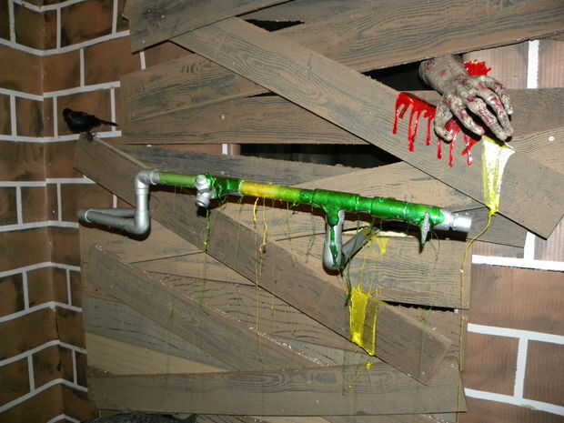 Para crear la apariencia de una ventana tapiada para arriba, utilizamos láminas de espuma de poliestireno que hemos comprado en una tienda de bricolaje grande caja y un par de colores de pintura acrílica que tenemos en el almacén del dólar.  Primero cortar la espuma en tiras como listones de madera y había pintado con una capa de base negra.  La utilizamos una capa de marrón y una madera de grano herramienta, que puede adquirirse en un DIY o madera tienda por menos de $5, para crear el aspecto de grano de madera.  Nos luego engraparlos en su lugar en nuestra pared de ladrillo del faux.  Esto funcionó bien ya que esta parte de la 'pared' era simplemente un marco de madera con ninguna pared real detrás de él.  También nos dio un lugar para montar nuestro tubo agujereado que goteaba agua coloreada en el barril de residuos tóxicos.  Para completar el look había colgado algunos de que el negro paisaje paño detrás de la ventana y brillaba una luz verde allí.  El limo se agregó a los tubos de la mano cortada y salpicaduras de sangre de tienda de dólar más.