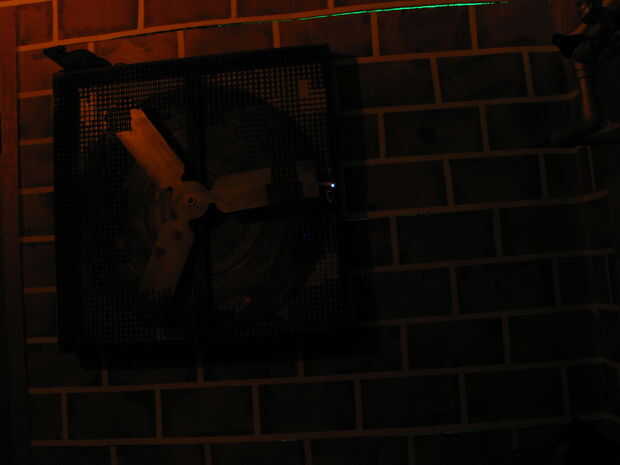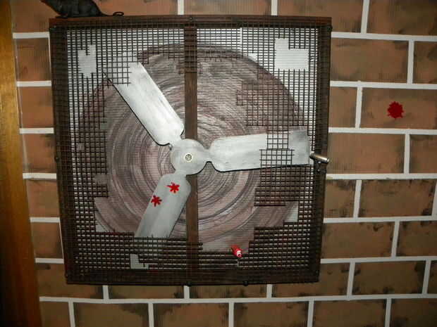 Ventilador industrial fue algo que vimos en la tienda de Halloween el año pasado, pero el costo era de $500!  Un poco fuera de nuestro presupuesto por lo que nos propusimos hacer.  Es un marco de madera, pintado y agobiados.  Las aspas del ventilador son realmente una pieza de madera de desecho que forma con una sierra de calar y pintado con pintura metálica como base y luego dificultades ver grasoso con nuestras pinturas de acrílico.  La cubierta del ventilador es algunas láminas de rejilla acuáticos plástico roto que teníamos en el garaje.  Sí, tenemos un montón de cosas en el garaje.  Rompió aún más para crear la apariencia que fueron después, aerosol había pintado negro y había añadido algunos pintura acrílica de color óxido.  Entonces estaba pegado a la parte superior del marco.  Las aspas del ventilador fue pegada sobre un eje central de madera para soportar el motor para el ventilador.  El fondo del ventilador era un pedazo de la cartulina acanalada que dibujamos círculos ásperos con un rotulador atado en el extremo de un trozo de cuerda (para conseguir la forma circular) y luego todo fue pintado y pegado en la parte posterior.