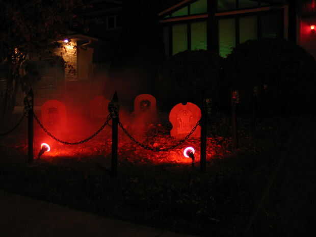 Cerca del cementerio de este año consta de tubo de pvc, pintado de negro junto con negro pintado conos espuma de poliestireno que recoger en la tienda de arte que fueron clavados en la parte superior. Los cráneos son aldabas de tienda de dólar de plástico y la cadena de plástico negro, escogió para arriba en venta en la tienda de bricolaje.