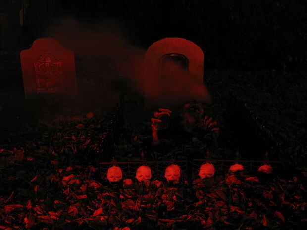 Para la tumba del zombi, marcados por una bolsa de plástico negra y dispersa goma paisajismo pedacitos sobre la parte superior para simular un recién cavado grave - luego ponemos en nuestro sistema de juego de zombie. La pequeña valla alrededor de esa tumba era algo que compramos en el almacén del dólar el año pasado antes de que 'habían actualizado' este año.