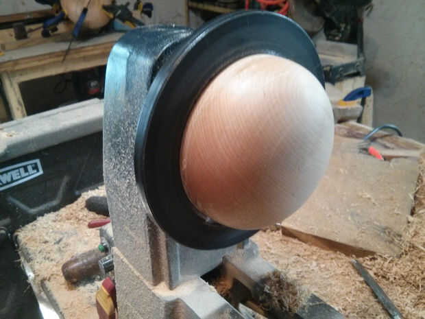 Instale su 5 "x 5" x1.75 "bloquean en la placa frontal, luego poco a poco con su gubia, reducir a un diámetro de 4". No te preocupes demasiado si deja un pequeño borde cerca de la placa frontal como sus herramientas no serán capaces de llegar a ese fin. Nos va ser lijado lo apagado cuando la parte superior se completa.