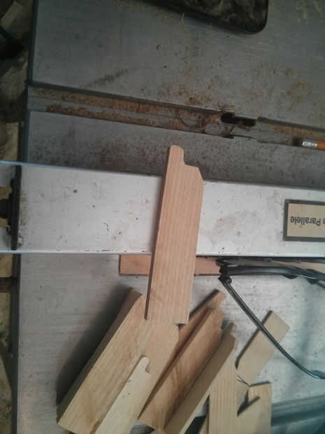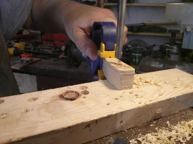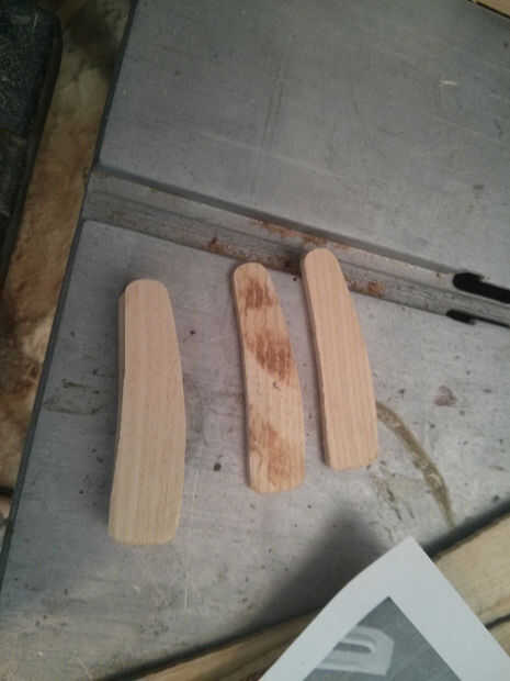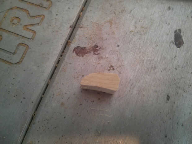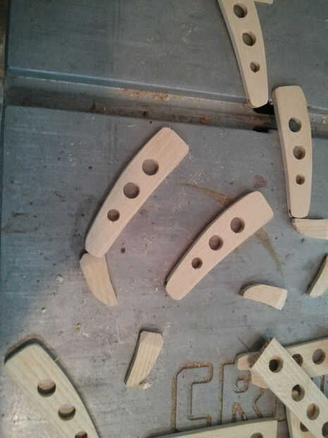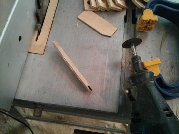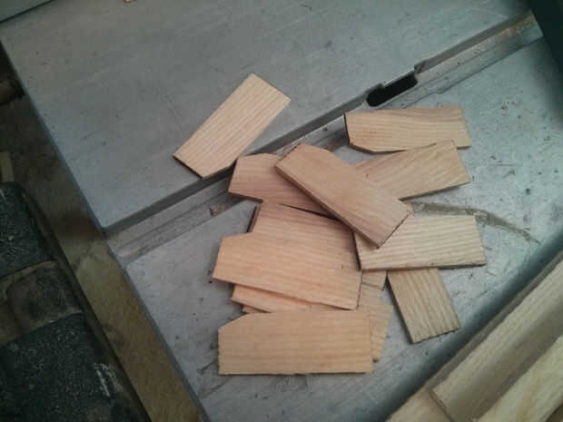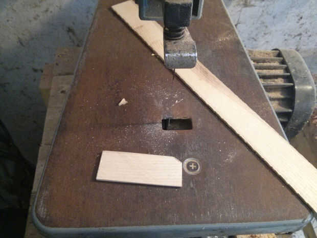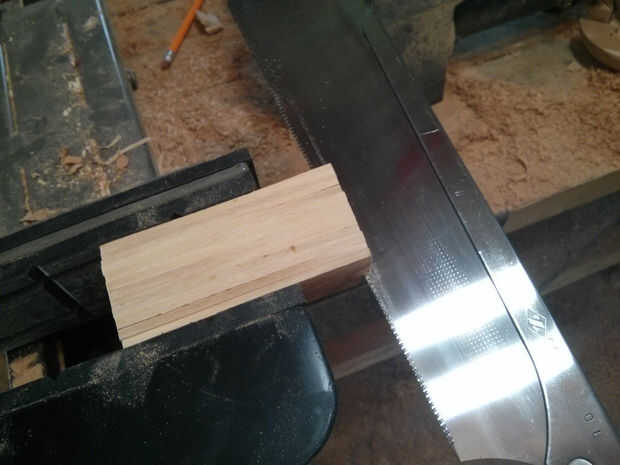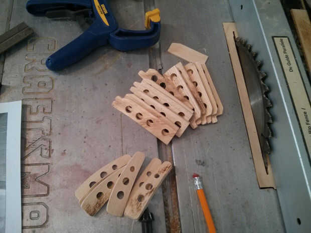 Una ficha de 1/4 "x 1/4" es creada por todas las piezas de sujeción en un tornillo de banco, entonces usando una cola de Milano vio, cortando el material no deseado (imagen 3). Las esquinas duras de las fichas se lija redondo (imagen 4). Hay un pequeño arco a la forma general de la pieza (imagen 5) con el borde inferior ligeramente cóncava y la parte superior ligeramente convexa. Esto se logró mediante la ejecución de todo el lote, juntos en la esquina de la lijadora de banco. Por último, una serie de orificios de 3/8" están perforados a lo largo de la pieza de la pierna (imagen 6) les afianza con abrazadera juntos y utilizando una prensa para perforar a través de ellos todos al mismo tiempo. La parte Final puede verse en la imagen 7.