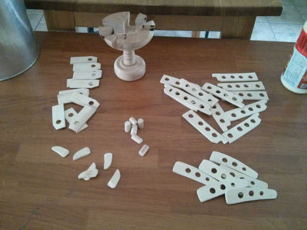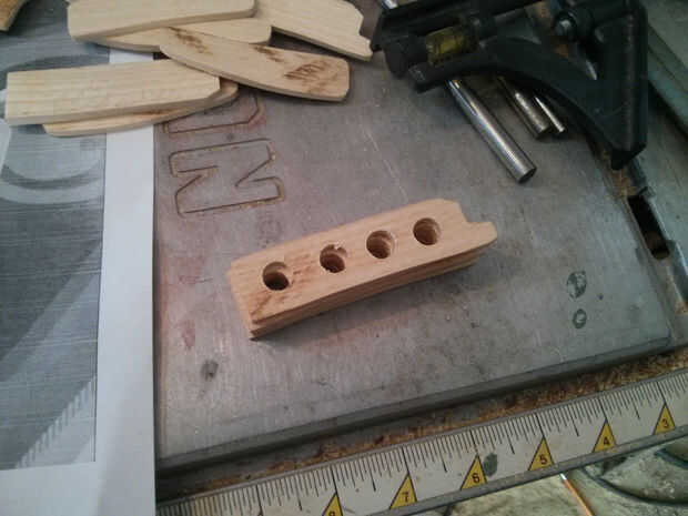 Cuando todas las piezas están completas, lijar todo con grano progresivamente más fino. Una forma rápida de hacerlo es una lijadora orbital, invertida, en un tornillo de la abrazadera y ejecutar cada pieza sobre él. Asegúrese de cada agujero, quitar todas las rebabas de la arena.