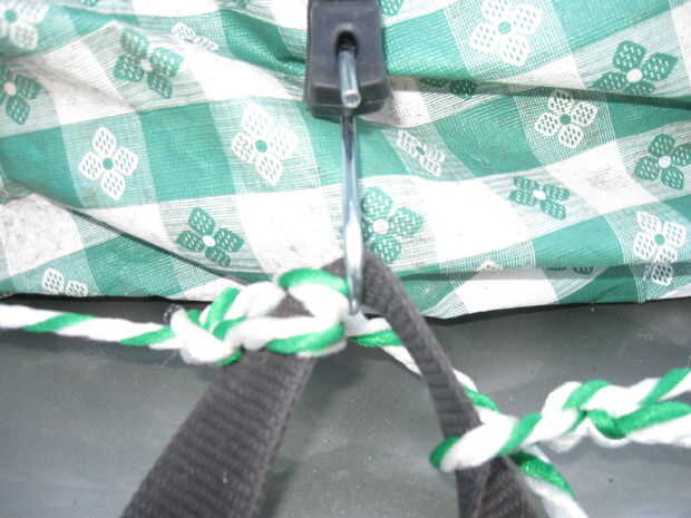 Aquí el ancla se usa para fijar dos cuerdas y un bungee Una cuerda va hacia la parte delantera de la carga El otro cable va a la parte posterior El amortiguador auxiliar nos va ovetr cable de la carga.